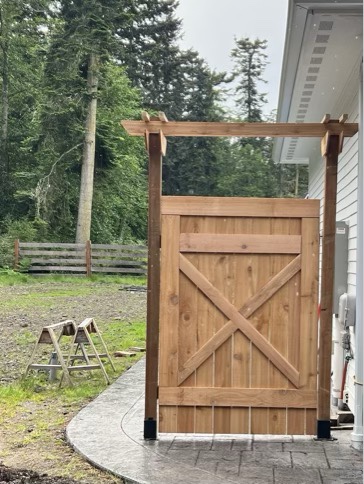Here’s the gate I built. I love the gate, BUT, I had asked the contractor who poured the patio/walkway to put in brackets into the concrete so they were secure and built-in. He told me that it’s no problem to just drill in brackets later. NOPE! What would have taken them 5 min to do, took me 3 trips to Home Depot, renting a rotary hammer and multiple concrete bolts/anchors to get the posts attached to concrete. Lesson – if you ask for something, stick to it and REQUIRE them to do it. The posts still wiggle front to back and I’m not happy with that so trying to figure out how to brace them.