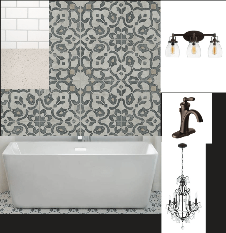 Iron Filigree vinyl flooring, that gorgeous tub, everything else same as other bathrooms. Considering a nice chandelier above the tub, but I’m not sure it goes with the vanity lighting so I dunno.